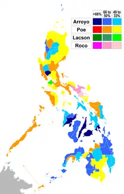 | Province/City | Arroyo | Poe | Lacson | Roco | Villanueva |