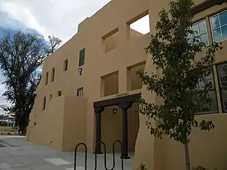 It was designed by architect George Williamson as an L-shaped building to serve as a dormitory. It is a three-story masonry and stucco building. It has "with irregular stepped massing, recessed fenestration, a flat roof and rounded parapets," and a recessed entryway "under a buttressed mission-like arch." Its bricks were made at the New Mexico State Penitentiary in Santa Fe.[2]