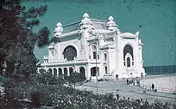 Three different buildings were constructed in the district to house a casino, with the first structure being erected of wood in 1880. Considered a symbol of the city of Constanța, the current structure was built in Art Nouveau style, designed and built according to the plans of Daniel Renard and inaugurated in August 1910.[2] The current Casino was used for gambling operations for 38 years, with interruptions due to the two world wars: attacked and bombed by Bulgarian and German troops in World War I, ravaged in World War II, and, at one point, acting as a makeshift wartime hospital. In 1948, it was transformed into a community centre, and in 1960, it was handed to the National Office of Tourism, which converted it into a restaurant. The last major repairs took place in 1986–1988, and the building was abandoned until 2019.[3] After five years of renovation works, the casino was again opened to visitors on 21 May 2025.[4][5]