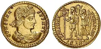 Sources variously report Constans' age at the time of his death as 27 or 30, meaning he was born in either 320 or 323.[3] Timothy Barnes, observing numismatic evidence, considered the younger age to be more likely.[10] He was the third and youngest son of Constantine I and Fausta.[11] According to the works of both Ausonius and Libanius, he was educated at Constantinople under the tutelage of the poet Aemilius Magnus Arborius, who instructed him in Latin.[3]