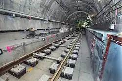 Blasting for the station caverns was finished in November 2013, and the muck houses were taken down at around the same time.[109] In the winter of 2013, many of the tracks and signal panels began to arrive at the construction site, to be installed on the line over the next few years.[110] It was reported in November 2013 that one third of the tracks for the line had arrived, for the segments of track between 87th and 105th Streets.[110] By August 2015, the construction project was 84.3% complete, with all ten Phase 1 construction contracts having been awarded and 5 of them having been completed.[111]