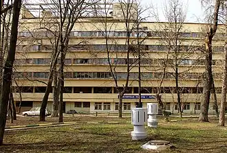 Collective housing projects that were built included Ivan Nikolaev's Communal House of the Textile Institute (Ordzhonikidze St, Moscow, 1929–1931), and Ginzburg's Moscow Gosstrakh apartments and, most famously, his Narkomfin Building.[9] Flats were built in a Constructivist idiom in Kharkiv, Moscow and Leningrad and in smaller towns. Ginzburg also designed a government building in Alma-Ata, while the Vesnin brothers designed a School of Film Actors in Moscow. Ginzburg critiqued the idea of building in the new society being the same as in the old: "treating workers' housing in the same way as they would bourgeois apartments...the Constructivists however approach the same problem with maximum consideration for those shifts and changes in our everyday life...our goal is the collaboration with the proletariat in creating a new way of life".[10] OSA published a magazine, SA or Contemporary Architecture from 1926 to 1930. The leading rationalist Ladovsky designed his own, rather different kind of mass housing, completing a Moscow apartment block in 1929. A particularly extravagant example is the 'Chekists Village' in Sverdlovsk (now Yekaterinburg) designed by Ivan Antonov, Veniamin Sokolov and Arseny Tumbasov, a hammer and sickle shaped collective housing complex for staff of the People's Commissariat for the Internal Affairs (NKVD), which currently serves as a hotel.