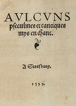 Title page of the 1539 Psalter, published in Strasburg when Calvin was a minister there. Calvin's psalters were called "Genevan" due to later editions after Calvin moved to Geneva.