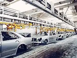 An overhead chain conveyor moves cars at Mercedes in Germany