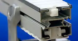 It usually consists of two fluid power cylinders [5] or also can use a motor driven cam.[6] For the cylinder driven fluid power type, one axis is for vertical motion and the other for horizontal. Both cam and fluid power types require nests at each station to retain the part that is being moved. The beam is raised, raising the part from its station nest and holding the part in a nest on the walking beam, then moved horizontally, transporting the part to the next nest, then lowered vertically, placing the part in the next station's nest. The beam is then returned to its home position while it is in the lowered position out of the way of the parts. This type of conveying system is useful for parts that need to be accurately physically located or relatively heavy parts. All stations are equidistance and require a nest to retain the part.