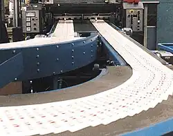Vertical lift conveyors contain two adjacent, parallel conveyors for simultaneous upward movement of adjacent surfaces of the parallel conveyors. One of the conveyors normally has spaced apart flights (pans) for transporting bulk food items. The dual conveyors rotate in opposite directions, but are operated from one gear box to ensure equal belt speed. One of the conveyors is pivotally hinged to the other conveyor for swinging the attached conveyor away from the remaining conveyor for access to the facing surfaces of the parallel conveyors.[2] Vertical lift conveyors can be manually or automatically loaded and controlled.[3] Almost all vertical conveyors can be systematically integrated with horizontal conveyors, since both of these conveyor systems work in tandem to create a cohesive material handling assembly line.