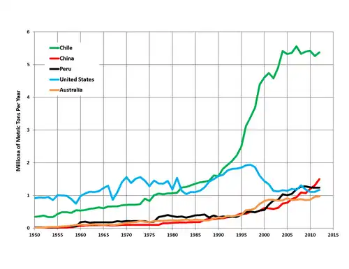 - ^ Average copper ore grades in Chile were of 1.27% in 2000 and of 0.86% in 2011, and for copper ores to be lixiviated grades went from 0.97% to 0.69% in the same period.[9]