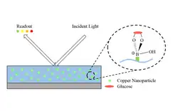 One of the examples is a glucose sensor. With the use of copper nanoparticles, the sensor does not require any enzyme and therefore has no need to deal with enzyme degradation and denaturation.[13] As described in Figure 3, depending on the level of glucose, the nanoparticles in the sensor diffract the incident light at a different angle. Consequently, the resulting diffracted light gives a different color based on the level of glucose.[12] In fact, the nanoparticles enable the sensor to be more stable at high temperatures and varying pH, and more resistant to toxic chemicals. Moreover, using nanoparticles, native amino acids can be detected.[13] A copper nanoparticle-plated screen-printed carbon electrode functions as a stable and effective sensing system for all 20 amino acid detection.[14] in situ, green and rapid method can synthesize copper oxide/zinc oxide on cotton fabric by using folic acid to increase the UV-protection properties of the fabric.[15]