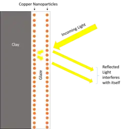 One of the earliest uses of copper nanoparticles was to color glass and ceramics during the ninth century in Mesopotamia.[1] This was done by creating a glaze with copper and silver salts and applying it to clay pottery. When the pottery was baked at high temperatures in reducing conditions, the metal ions migrated to the outer part of the glaze and were reduced to metals.[1] The result was a double layer of metal nanoparticles with a small amount of glaze in between them. When the finished pottery was exposed to light, the light would penetrate and reflect off the first layer. The light penetrating the first layer would reflect off the second layer of nanoparticles and cause interference effects with light reflecting off the first layer, creating a luster effect that results from both constructive and destructive interference.[2]