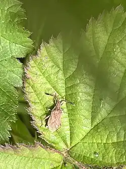 Coriomeris denticulatus is a small, brownish bug measuring 8.5 to 10 mm. It features a quadrangular head, short space between the eyes, and a toothed posterior pronotal edge. Its antennae have four segments with the third as long as the second, and the hind femora have two large teeth. This species can be identified by its moderately difficult characteristics, distinguishing it from similar species like Coriomeris affinis. Observed from April to September, peaking in May, it is polyphagous on over 20 plant species, mainly found on clovers and melilotus. Adults and nymphs overwinter in leaf litter or moss, with eggs laid in June-July and a new generation appearing mid-July to mid-September. It is native to Western Europe, extending to the Ural Mountains, Turkey, Israel, and North Africa, favoring dry, sandy areas, forest edges, and sunny, warm locations.[2]
