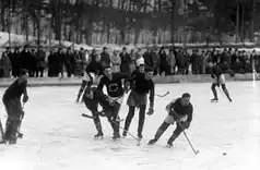 Cornell's history with ice hockey begins at the close of the 19th century, with the first organized game being played in March 1900 against the University of Buffalo.[8] Cornell was embarrassed in their first appearance, losing 1–10, but that didn't dissuade the school from pression forward. The next year in Philadelphia, the ice hockey squad played a total of three games over a four-day period, winning each contest. That weekend Cornell employed G. A. Smith as the team's coach but for the next eight years the club would go without. That was perhaps just as well as Cornell played four games over a three-year period, with each match being held at the St. Nicholas Rink in New York City, and was then mothballed for two years. The newly rechristened Big Red[9] returned in February 1907, playing a two-game set on campus for the first time. With no indoor or even artificial facility available all home games were played on Beebe Lake. This ended up being a rather poor arrangement since the ice hockey team would have to rely on good weather for their games until the second half of the century.