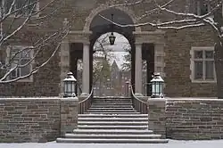 Several Cornell University buildings have been named National Historic Landmarks,[43] and ten have been listed on the National Register of Historic Places: Andrew Dickson White House, Bailey Hall, Caldwell Hall, the Computing and Communications Center, Morrill Hall, Rice Hall, Fernow Hall, Wing Hall, Llenroc, and Deke House.[44] Three other listed historic buildings, the original Roberts Hall, East Robert Hall, and Stone Hall, were demolished in the 1980s to make way for new campus buildings and development.[45]