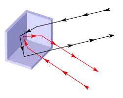 The incoming ray is reflected three times, once by each surface, which results in a reversal of direction.[1][2] To see this, the three corresponding normal vectors of the corner's perpendicular sides can be considered to form a basis (a rectangular coordinate system) (x, y, z) in which to represent the direction of an arbitrary incoming ray, [a, b, c]. When the ray reflects from the first side, say x, the ray's x component, a, is reversed to −a while the y and z components are unchanged, resulting in a direction of [−a, b, c]. Similarly, when reflected from side y and finally from side z, the b and c components are reversed. Therefore, the ray direction goes from [a, b, c] to [−a, b, c] to [−a, −b, c] to [−a, −b, −c], and it leaves the corner reflector with all three components of direction exactly reversed. The distance travelled, relative to a plane normal to the direction of the rays, is also equal for any ray entering the reflector, regardless of the location where it first reflects.