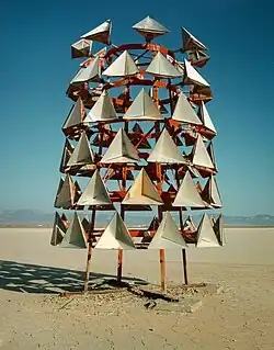 Radar corner reflectors are designed to reflect the microwave radio waves emitted by radar sets back toward the radar antenna. This causes them to show a strong "return" on radar screens. A simple corner reflector consists of three conducting sheet metal or screen surfaces at 90° angles to each other, attached to one another at the edges, forming a "corner". These reflect radio waves coming from in front of them back parallel to the incoming beam. To create a corner reflector that will reflect radar waves coming from any direction, 8 corner reflectors are placed back-to-back in an octahedron (diamond) shape. The reflecting surfaces must be larger than several wavelengths of the radio waves to function.[3]