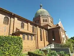 Corpus Christi Church was planned to be a golden link in the chain of churches around Brisbane. Some sources state that it was a scale model for the Holy Name Cathedral, which was planned for a site in Ann Street, across the street from All Hallows' School. The design of both of these Hennessey and Hennessey buildings was thought to be reminiscent of St. Peter's Basilica in Rome, which has the characteristic dome, surmounted by a lantern and cross.[1]