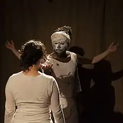 Actor Marcus Stewart wearing bold face makeup in the play Oresteia by Aeschylus (2019)