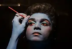 An actor applying bold makeup for a stage performance