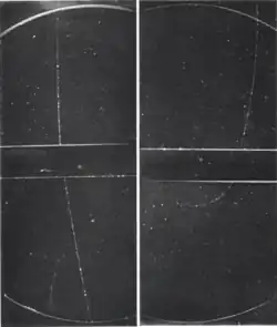 Left image: cosmic ray muon passing through a cloud chamber undergoes scattering by a small angle in the middle metal plate and leaves the chamber. Right image: cosmic ray muon losing considerable energy after passing through the plate as indicated by the increased curvature of the track in a magnetic field.