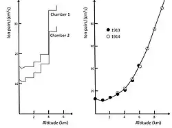 Increase of ionization with altitude as measured by Hess in 1912 (left) and by Kolhörster (right)