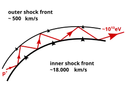 Shock front acceleration (theoretical model for supernovae and active galactic nuclei): Incident proton gets accelerated between two shock fronts up to energies of the high-energy component of cosmic rays.
