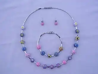 Costume or fashion jewelry includes a range of decorative items worn for personal adornment that are manufactured as less expensive ornamentation to complement a particular fashionable outfit or garment[1] as opposed to "real" (fine) jewelry, which is more costly and which may be regarded primarily as collectibles, keepsakes, or investments. From the outset, costume jewelry — also known as fashion jewelry — paralleled the styles of its more precious fine counterparts.[2]