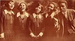 The Piney Woods School was founded by Laurence C. Jones and the first classes were held outside in 1909. Similar to earlier ventures by blacks, the school had financial difficulties and the Cotton Blossom Singers was formed to raise money for the building. Jones's wife, Grace Morris Allen Jones, led the first iteration of the group although it is disputed what year they first sang. Historian Beth Day thinks that this first happened in spring 1921, but historian Alferdteen Harrison has suggested that the first group sang in summer 1923. Grace's role was sometimes to be the pianist, but she did not think of herself as a musician. The first group of the Cotton Blossom Singers sang spirituals and folk songs. In 1926, four groups of students toured through the United States; later, up to 13 groups toured at the same time, each group assigned to their own region.[1]