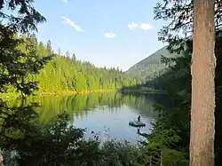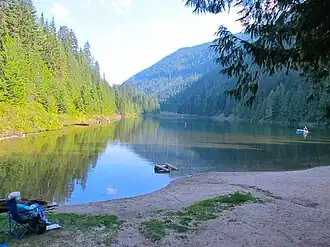 The lake is the fed by Cottonwood Creek, which has its source just south of the lake near Apex Summit at the Highway 6 turnoff for Whitewater Ski Resort.[2] The headwaters of the Salmo River are only a few metres away from that of Cottonwood Creek, which flows to the south to the Pend d’Oreille River.[3]