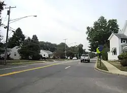 At this point, CR 547 turns east to run concurrently with CR 528 on East Veterans Highway; CR 639 continues north on North Hope Chapel Road. The two routes continues through residential and commercial development, intersecting with Cross Street (CR 626) before crossing into Lakewood. At this point, CR 528/CR 547 turns northeast into wooded residential neighborhoods. In this area, the route turns east onto Central Avenue and passes more homes before crossing Lake Carasaljo and coming to an intersection with US Route 9 (US 9). At this point, CR 528 continues northeast on Hurley Avenue, and CR 547 turns north to follow US 9 on Madison Avenue, crossing the Metedeconk River, from which Lake Carasaljo is formed. After intersecting with Main Street (Route 88), Madison Avenue continues north through the commercial and residential center of Lakewood as a four-lane undivided road; CR 547 splits from US 9 by turning east onto two-lane 8th Street. The route passes through residential areas before splitting from 8th Street by turning northeast onto Squankum Road. Signage along US 9 shows CR 547 leaving the concurrency at 9th Street.[2] Along this stretch, CR 547 runs through wooded areas of homes, crossing the intersection of East County Line Road (CR 526).[1][2]