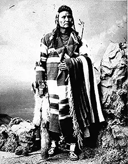 After crossing the river, the main body of the Nez Perce went past the soldiers without incident, and camped about two miles up Cow Creek. A small group of Nez Perce rode to the entrenchment. They indicated friendly intentions and asked for some of the stockpiled food. The army sergeant in charge at first ignored their request which reduced the Nez Perce to begging. Finally the sergeant gave them one bag of hardtack and one side of bacon from the soldier's own stores.[4] At sundown gunfire broke from Indians in the breaks, who had located themselves so they could fire down into the entrenchment. Two civilians were wounded and the soldiers, though able to return fire, were now pinned down. The supplies were far enough from the entrenchment so that, as night fell, the Indians could filter out of the steep eroded breaks and get to the supplies without coming under effective fire. After dark the Indians broke into the supplies, and took what they found desirable in the dark. The supplies were set on fire. A large stockpile of bacon burned brightly for most of the night.[4] The soldiers attributed the illumination from this blaze with preventing a concerted attack, but it is more likely that the Nez Perce only wanted the supplies and not a pitched battle with the soldiers. The Indians and the soldiers exchanged sporadic gunfire through the night until about 10:00 in the morning, after which the Nez Perce moved off up Cow Creek. Two civilians and one Nez Perce warrior were wounded.[4]