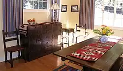 The Imperial furniture line conserved for Crater Lake National Park by MPF Conservation. The line was originally purchased by the NPS through Meier & Frank in Portland, Oregon. It is one of two largest complete lines known in existence in a public place, the other being a line of Mason Monterey furniture just a few hours away at the Oregon Caves National Monument. The Imperial furniture line is one of the best known of the Furniture lines popularized at the time of Monterey. It was made in Los Angeles, California in the early 1930s. The Imperial line utilized mahogany as their primary wood, usually stained dark brown with a silvery sheen, created by grain filler, probably silex or calcium chloride. The line was solid and heavy, accented by top quality ironwork. Originally the line was upholstered in a multicolored cotton weave in a fiesta-influenced pattern. The restoration show covers chosen were rich red and cordovan colored waxed top grain aniline leathers, which was also appropriate to the time.[8]