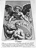 Creation of the World is a mosaic composition in the dome of the Chigi Chapel in Santa Maria del Popolo, Rome, designed by Raphael. The chapel itself was designed by Raphael for his friend and patron, banker Agostino Chigi as a private chapel and family burial place. The dome was decorated with mosaics, a somewhat unusual and old-fashioned technique in the 16th century. Raphael's cartoons were executed by a Venetian craftsman, Luigi da Pace in 1516. The original cartoons were lost but some preparatory drawings, that confirm the originality of the work, survived in the Ashmolean Museum, Oxford. There are two studies for the figure of God and one for the angel above Jupiter. Another drawing in the Palais des Beaux-Arts in Lille shows the planet Mars with an angel. This is probably a creative drawing by a pupil suggested by its inferior quality.[1] Luigi da Pace signed and dated the work at the corner of the panel of Venus:[2]