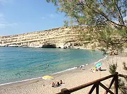 The rivers of Crete include the Geropotamos River, the Koiliaris, the Anapodiaris, the Almiros, the Giofyros, the Keritis, and Megas Potamos. There are only two freshwater lakes in Crete: Lake Kournas and Lake Agia, which are both in Chania regional unit.[21] Lake Voulismeni at the coast, at Aghios Nikolaos, was formerly a freshwater lake but is now connected to the sea, in Lasithi.[22] Three artificial lakes created by dams also exist in Crete: the lake of Aposelemis Dam, the lake of Potamos Dam, and the lake of Mpramiana Dam.