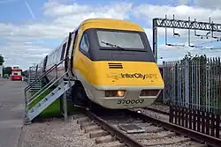 Built by British Rail (BR) the 1970s and 1980s, this Class 370 Advanced Passenger Train (APT) is the only surviving APT-P set. Numbered 370 003/006, it is open at all times with an occasional cafe run from the original buffet car (selected days only). The APT-P museum can be found inside one of the carriages, with photographs on display from the APT project. The set was tilted for the first time in preservation in 2013. In early 2018, an additional surviving APT powercar (M49006) arrived at the museum. It is displayed separately alongside the main set.
