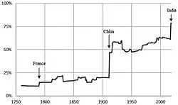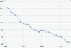 There was a wave of decriminalization in the late twentieth century; ninety percent of changes to these laws between 1945 and 2005 involved liberalization or abolition.[49] Eighty percent of repeals between 1972 and 2002 were done by a legislature, and the remainder by the laws being ruled unconstitutional by a court.[54] Decriminalization began in Europe and the Americas and spread globally in the 1980s.[55] The pace of decriminalization reached a peak in the 1990s. Following the dissolution of the Soviet Union, many former Soviet republics decriminalized homosexuality,[56] but others in Central Asia retained these laws.[57] China decriminalized homosexuality in 1997.[48] Following a protracted legal battle, the Supreme Court of India ruled that the criminalization of homosexuality violated the Constitution of India in the 2018 Navtej Singh Johar v. Union of India judgement.[58][59]