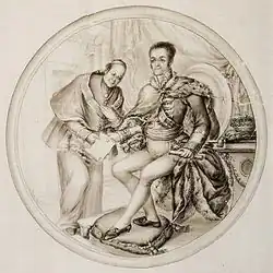 The King Ferdinand VII delivery to Cristóbal Bencomo the papal bull of creation of the Diocese. Engraving of Juan Abreu, ca. 1830.