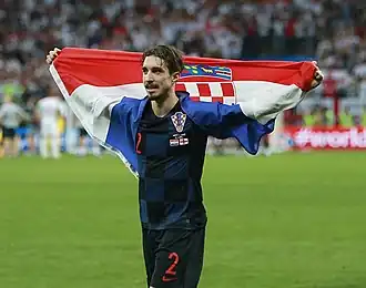 The team's image references the national colors of Croatia. Pictured: Šime Vrsaljko, 2018.