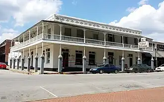 The Crown Hotel, formerly the Lakeside Hotel is a historic hotel building at 119 West University Street in Siloam Springs, Arkansas. It is a two-story brick building in an L shape, with a hip roof topped by a low cupola. It is distinguished by the brickwork at the roofline, and by the delicately spindled two-story porch that wraps around two sides of the building. Built in 1881, just one year after the city's founding, it is one of the city's oldest commercial buildings, and may have been its first brick hotel.[2]