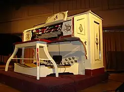 During the restoration of the theater, a vintage pipe organ was purchased and installed to replace the original theatre organ, which had been sold earlier. The current organ is the largest theatre pipe organ in Michigan's Upper Peninsula. The organ, consisting of three manuals and 21 ranks (sets of pipes), was originally built in 1927 by the M. P. Moller Company of Hagerstown, Maryland.[3] There are more than 1,600 pipes, installed in the on-stage chambers, ranging in size from half an inch to over 16 feet in length. In addition, there is an assortment of actual tuned percussions, drums, and sound effects installed in two chambers, located on either side of the proscenium. The Möller organ was originally installed in the Illinois College of Music in Chicago where it was used to teach accompaniment and scoring for silent films.[4] There is some additional pipe-work in the instrument that came from another, similar Möller theater organ from Brooklyn. In addition to the organ, there is a Steinway Model D grand piano.[5]