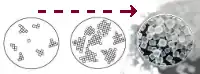 Secondary nucleation is the formation of nuclei attributable to the influence of the existing microscopic crystals in the magma.[6] More simply put, secondary nucleation is when crystal growth is initiated with contact of other existing crystals or "seeds".[7] The first type of known secondary crystallization is attributable to fluid shear, the other due to collisions between already existing crystals with either a solid surface of the crystallizer or with other crystals themselves. Fluid-shear nucleation occurs when liquid travels across a crystal at a high speed, sweeping away nuclei that would otherwise be incorporated into a crystal, causing the swept-away nuclei to become new crystals. Contact nucleation has been found to be the most effective and common method for nucleation. The benefits include the following:[6]