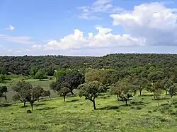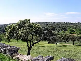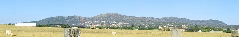 To the south of this mountain range, the terrain descends to the Monte de El Pardo, the third geomorphological unit through which the park runs, covering approximately 16 000 hectares.[8] The granitic materials give way to detrital and sandy elements, the result of the erosion of the Guadarrama and Hoyo mountain ranges, which form an undulating landscape of gentle hills, with an average altitude of 600 m. The Monte de El Pardo sits on an immature soil, easily eroded. Similar characteristics are found in Monte de Viñuelas, eastern appendix of El Pardo.
