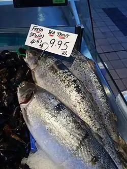 Sewin is known as the prince of Welsh fish.[2] They feed more locally than salmon and hence are more distinctive from region to region, with a pale, pinky flesh and a high oil content.[2] The season begins around Easter and ends in the summer, with the largest fish having the earliest run up the rivers.[2] Sewin range in size from less than a pound in weight to 3 lbs, known as shiglin (the smallest) and twlpin (the larger) in late July and August, to fully grown fish known as gwencin, which equal a salmon in size and come in May or June (or earlier), and again in September.[16] Large sewin can be distinguished from salmon by the tail: the tail is more deeply indented, the colour is browny-grey instead of blue-grey, and the body is slimmer near the tail.[16] Welsh anglers claim that the Tywi yields more sewin over 10 lbs than every sea-trout river in England and Scotland put together.