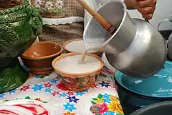 Despite the introduction of wheat and rice to Mexico, maize is the most commonly consumed grain in almost all areas of the country and serves as the main ingredient in many local recipes (such as maize tortillas, atole, pozole, menudo, and tamal). While also eaten fresh, most maize is dried, nixtamalized and ground into a dough called masa.[13][14] This dough is used both fresh and fermented to make a wide variety of dishes, from drinks (such as atole and pozole) to tamales, sopes, and many other foods. However, the most common way to eat maize in Mexico is in the form of tortillas, which accompany almost every dish. Tortillas are made of maize in most of the country, but other regional versions exist, such as wheat in the north or plantain, yuca and wild greens in Oaxaca.[4][13]