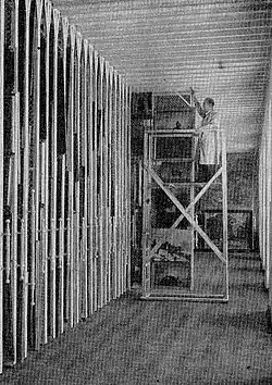 Sliding racks are typically used for the storage of framed works of art, where works are hung on a wire rack connected to tracks that are suspended from channels on the floor and ceiling, which keeps the racks from swaying.[1] This type of system allows great variation, as the distance between racks can be adjusted to accommodate large or small frames, and works can be organized to make the most of the space while keeping them in their upright position to avoid damage.[1] These types of sliding rack systems can also be a closed unit, where the end of each rack has a panel with a gasket and closed walls at either end, or each individual rack can be a sealed space in itself, which is typically used for textile display or visible storage systems, where the objects are encased in a transparent rack.[1] Mobile racks can also be utilized to hang textiles, where the textiles can either be draped over a bar, or supported by hooks attached to frames.[1] Racks can also be mounted to the walls of storage spaces, utilizing the perimeter space of a storage area, which is safest for framed objects that should not be moved often, such as framed pastel drawings.[1]