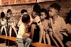 Children peer over shoulders to see what their friends are reading.