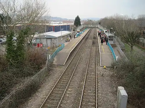 Cwmbran railway station (Welsh: Gorsaf Rheilffordd Cwmbrân) is in the northeast of Cwmbran town centre, within five minutes' walking distance. It is part of the British railway system owned by Network Rail and is managed by Transport for Wales, who operate all trains serving it. It lies on the Welsh Marches Line from Newport to Hereford. The station was opened at this site in 1986 to serve the commuter route to Newport and Cardiff, and shoppers to the town centre.