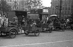 Only two forms of transportation were then available in the city; the cab and the electric train. The latter could run only on ten-kilometre (six-mile) tracks. Trishaws could reach every nook and cranny, so the spirit of nationalism plus the advantage of trishaws reaching everywhere made them so popular among Mandalayans that even the train company had to stop its business.[39][40]