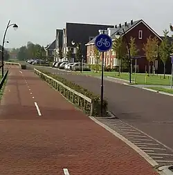 A 2-1 road is a roadway striping configuration which provides for two-way motor vehicle and bicycle traffic using a central vehicular travel lane and "advisory" bike lanes on either side. The center lane is dedicated to, and shared by, motorists traveling in both directions. The center lane is narrower than two vehicular travel lanes and has no centerline; some are narrower than the width of a car. Cyclists are given preference in the bike lanes but motorists can encroach into the bike lanes to pass other motor vehicles after yielding to cyclists. Advisory bike lanes are normally installed on low volume streets.[13] Advisory bike lanes have a number of names. The U.S. Federal Highway Administration calls them "Advisory Shoulders".[34] In New Zealand, they are called 2-minus-1 roads. They are called Schutzstreifen (Germany), Suggestiestrook (Netherlands), and Suggestion Lanes (a literal English translation of Suggestiestrook).[35]