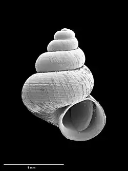 The shell grows up to a height of 2.03 millimetres (0.080 in). The shell height is larger than the width, with the height/width ratio being 1.32–1.45. It has a "translucent, yellowish brown" colour.[1]
