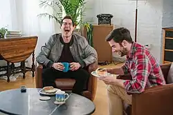 Levy shooting a promo for his 2016 special, Dan Levy: LION, with longtime friend John Mulaney