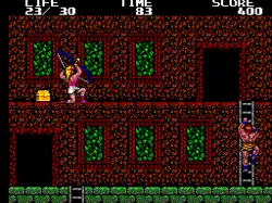 Danan climbs a ladder to the upper level of the building. The HUD on the top of the screen shows how much health, time remaining, and score that Danan has.